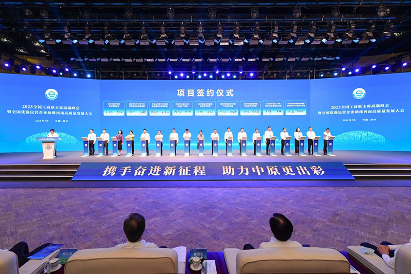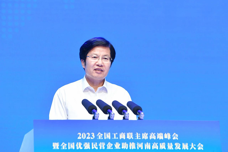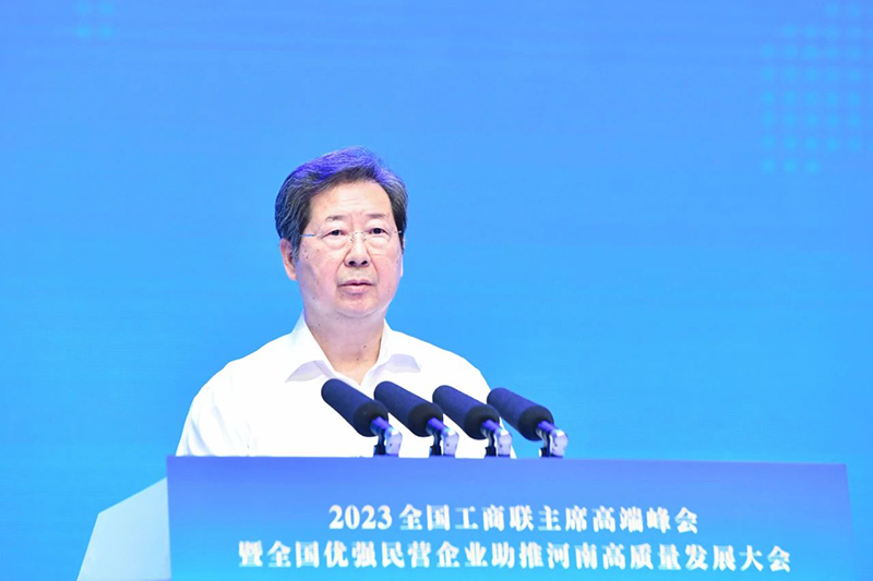 7月26日,2023全国工商联主席高端峰会暨全国优强民营企业助推河南高质量发展大会在郑州举行。会议以“携手奋进新征程助力中原更出彩”为主题,由全国工商联、河南省人民政府共同举办。全国政协副主席、全国工商联主席高云龙出席会议并讲话,河南省委书记、省人大常委会主任楼阳生出席会议并致辞,河南省委副书记、省长王凯主持会议。中央统战部副部长、全国工商联党组书记徐乐江,河南省政协党组书记、主席孔昌生出席会议。