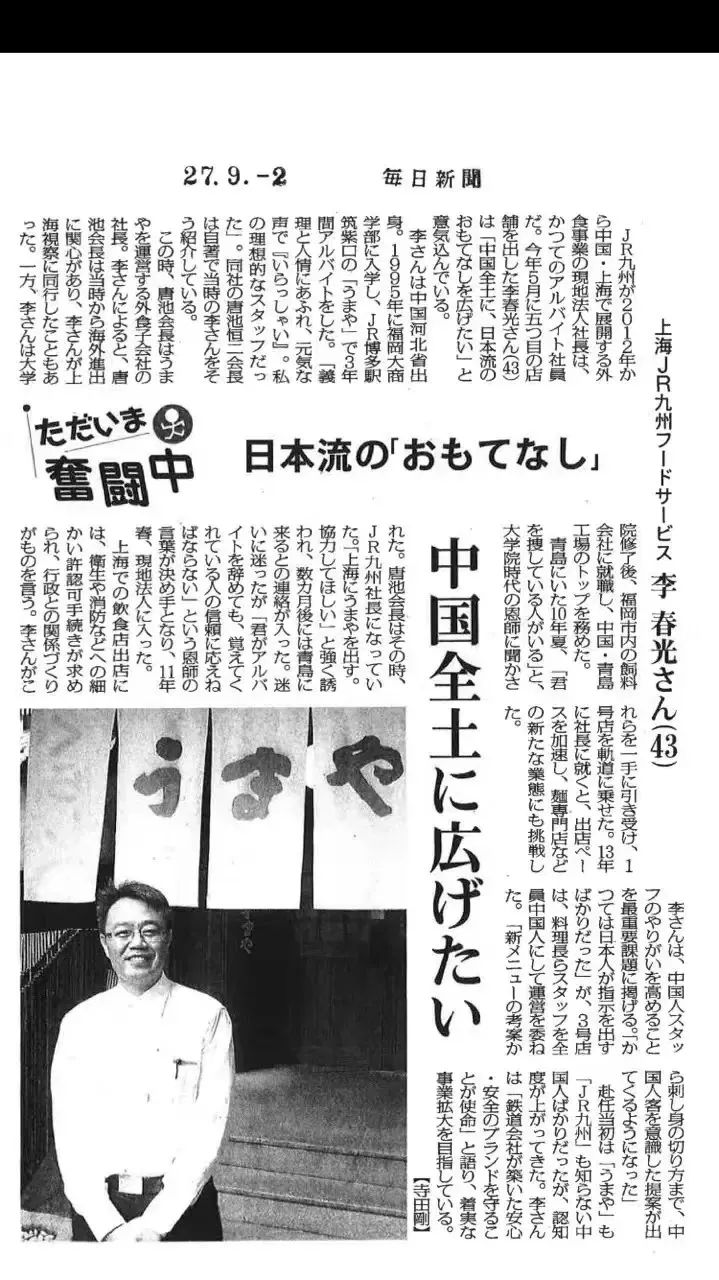 李春光人如其名,言辞温煦,为人处事谦逊有礼,加上博士头衔以及前些年在国内累积的经历,很快打开了局面,从副总经理做到董事长、总经理,决策与经营双肩挑,代表JR九州全权打理在上海的餐饮事务。
