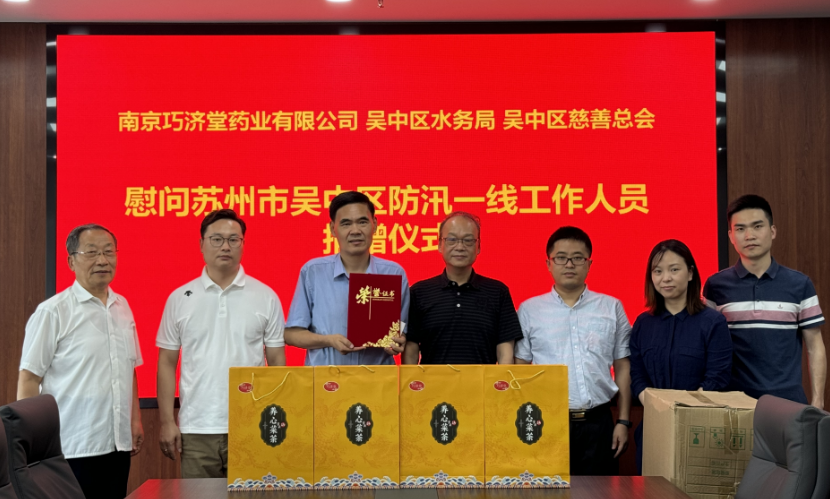 入梅以来, 江河水涨,汛情就是命令。7月18日,南京金陵商会党支部书记顾宝太,执行会长邹俭、副会长陈智耀、理事成海丰和南京邵氏宗亲会邵民龙代会长一行驱车前往苏州吴中区慈善总会,捐赠南京巧济堂药业有限公司生产的景天三七养心菜茶200盒,价值196000元,用于支持吴中区水务局(区防汛抗旱指挥部办公室)防汛抢险救灾工作。