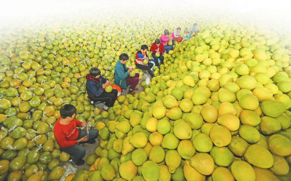 梅州市梅县区大黄村党员示范社的柚子仓储基地里,金柚堆成小山,村民正在包装柚果。