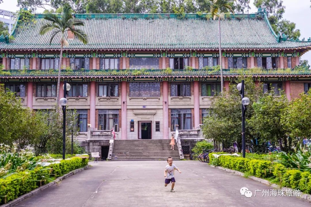 自南往北连绵十几栋学生宿舍楼,绿榕丛中,藏有一座气度不凡的宫殿式建筑,红墙琉璃瓦大屋顶,依然传统的岭南康乐园特色,雅称“东区明珠”——广寒宫。