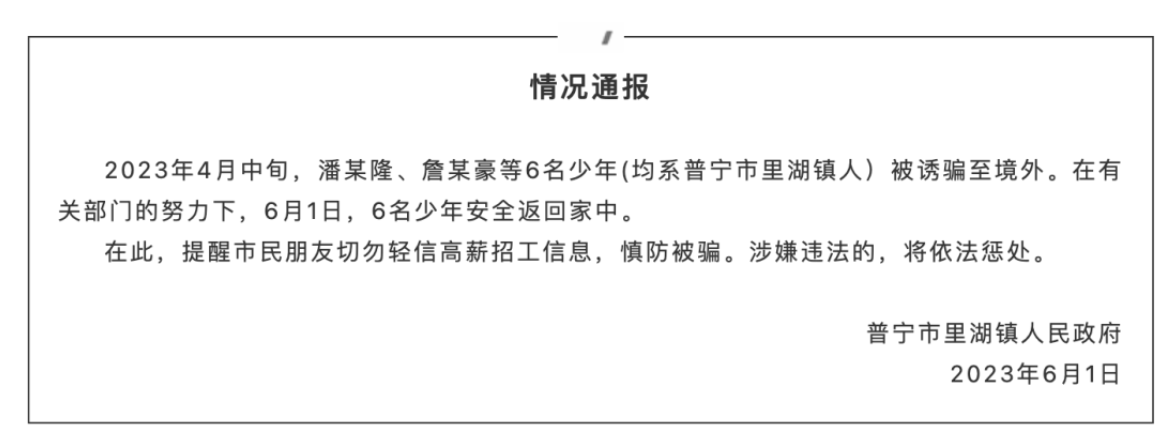 据“普宁发布”微信公众号消息,普宁市里湖镇人民政府情况发布通报称,2023年4月中旬,潘某隆、詹某豪等6名少年(均系普宁市里湖镇人)被诱骗至境外。在有关部门的努力下,6月1日,6名少年安全返回家中。