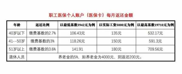 一并返到医保卡中; 45周岁到退休之前的职工,每月按社保缴费基数的2%(个人缴费部分)加上单位缴纳的8%的部分。一并返到医保卡中; 退休的职工,按上一年本市职工平均工资水平的1%返到医保卡之中。