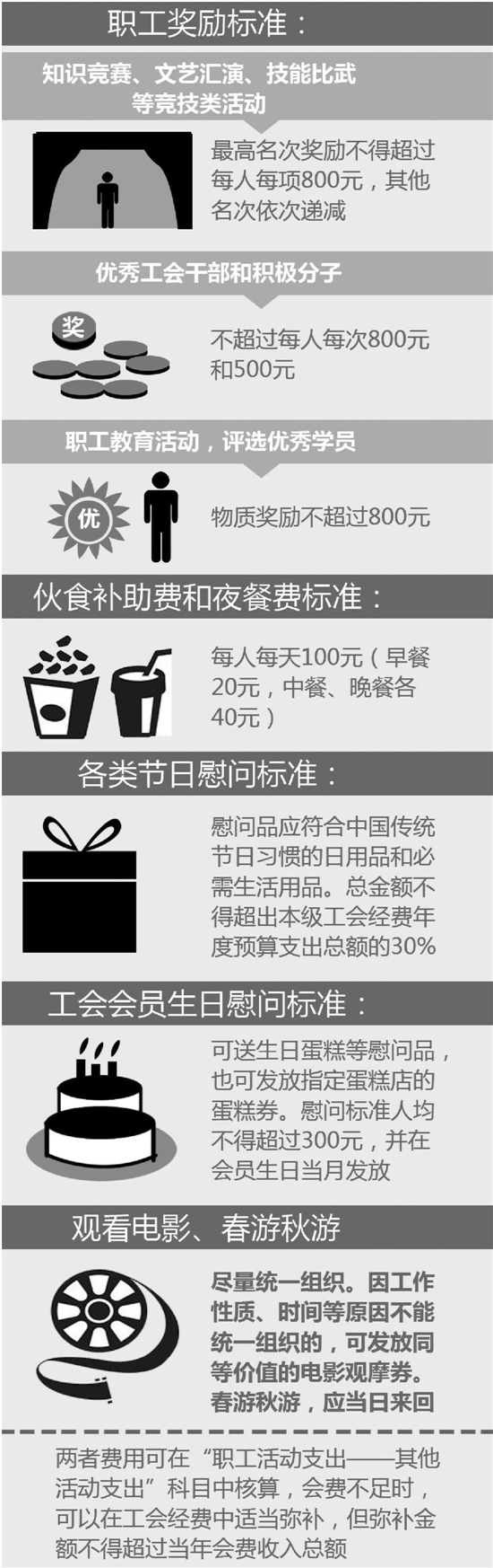 近日,全国总工会下发《关于加强基层工会经费收支管理的通知》(以下简称《通知》)的补充通知,针对全国各级工会组织使用工会经费为职工发放福利,做了细节性的解释,明确了过年过节工会怎么发福利、慰问品。