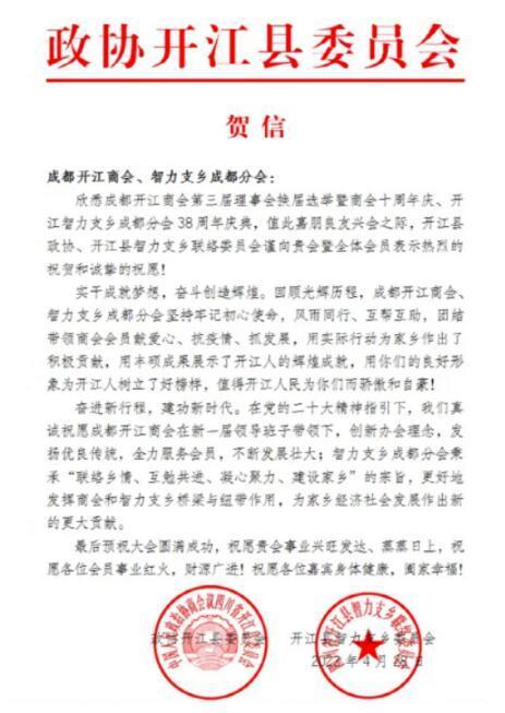 会上展示了来自开江政协、达州总会、成都达州商会、成都南充商会、北京达州企业家商协会、成都宣汉商会、成都达川商会、成都大竹商会、成都渠县商会、广东开江商会、重庆开江商会、驻蓉老协等发来的贺信!