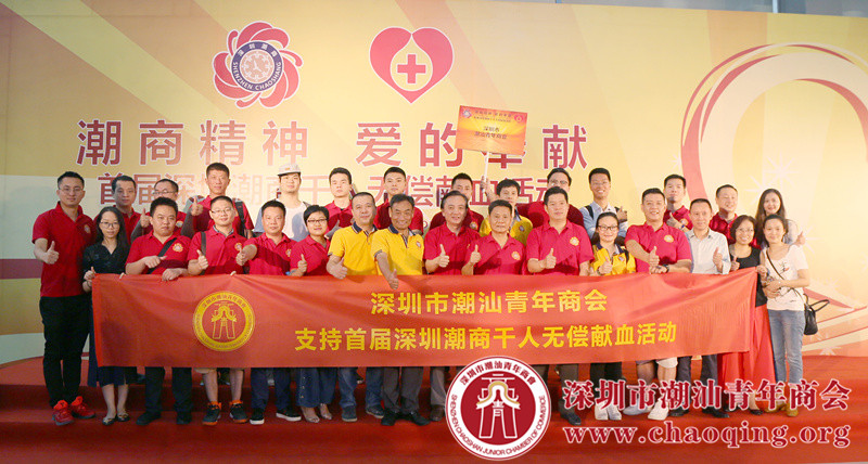 2017年8月20日,由深圳市潮汕商会、深圳市血液中心联合主办,深圳市潮汕青年商会等17家潮属社团协办的“潮商精神 爱的奉献——首届深圳潮商千人无偿献血活动”在会展中心举行。图为黄育宏会长与深圳市潮汕青年商会代表团合影。