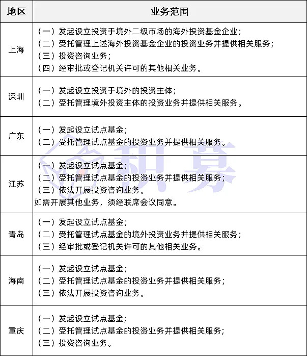 作为QDLP试点基金管理人,其业务范围比较简单,各地也基本上保持一致,主要是可以发起设立QDLP基金,受托管理QDLP基金的投资业务并提供相关业务。部分地区,比如上海、江苏、海南、重庆,还可以开展投资咨询业务。但是,由于QDLP试点基金管理人及基金需要到中基协登记备案,也要满足私募基金关于经营范围的要求。