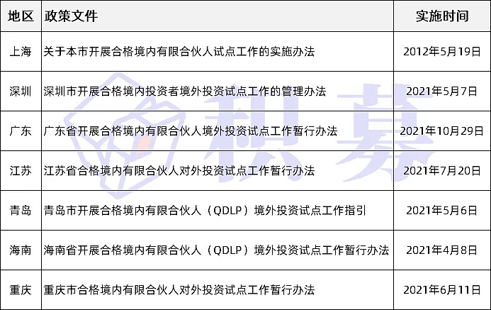 小编收集了上海、深圳、广东、江苏、青岛、海南、重庆7个地区的QDLP政策。其中,深圳地区有所不同,政策称为QDIE,即Qualified Domestic Investment Enterprise,中文直译为合格境内投资企业,其本质与QDLP相似。