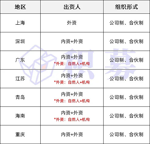 组织形式层面与目前私募基金的主要组织形式一致。如果是QDLP试点基金管理人,可以设立为公司制、合伙制;如果是QDLP试点基金,大部分地区都可以设立成公司制、合伙制或者契约制,只有个别地区有特殊要求。
