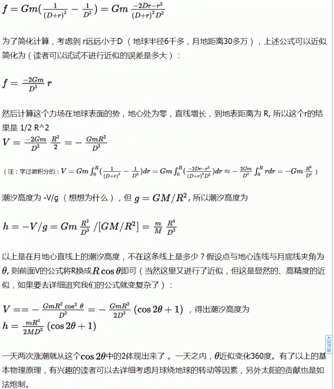 首先,计算在月-地线上,离地心r处月球引力与地心出月球引力场之差 (地球半径为R, 月地距离为D,月球质量为m, 地球质量为M),这用到牛顿万有引力定律,引力与引力源的质量成正比,与距离平方成反比。