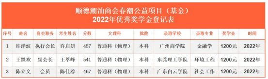 2、“励志奖学金”:资助就读于顺德职业技术学院,成绩优秀但家庭贫困的潮籍学子(侧重于入学的大一学生),每年3000元/人。