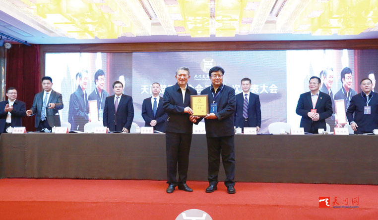 全球楚商联合会总会长、天门楚商联合会创会会长、总顾问陈东升(前左)为天门楚商联合会新任会长罗爱平授牌。