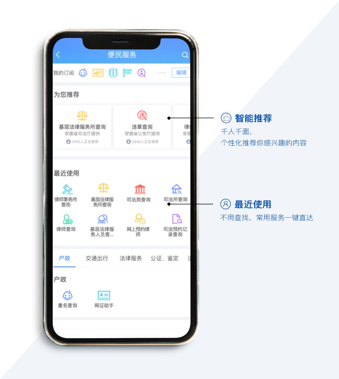 “为您推荐”:千人千面,根据用户属性、地域特征和使用习惯,向用户推荐个性化的定制服务。