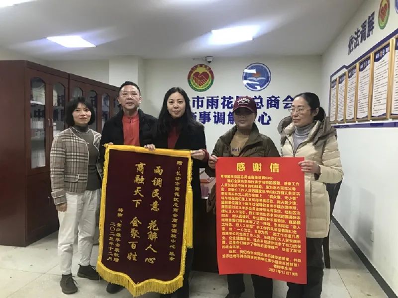 12月13日上午,雨花区总商会商事调解中心来了两位特殊的客人。市民杨女士和家人送来一面绣有“雨调民意 花解人心 商融天下 会聚百姓”的锦旗和一封感谢信,对商调中心工作人员张余倾心倾力为民办实事给予高度评价,对雨花区总商会商事调解中心帮其家庭解决了困扰大半年的大难题表示衷心的感谢。