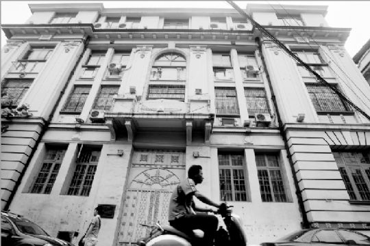 在今武汉市最繁华的商业中心江汉路的对面,沿水塔往京汉大道方向行走百余米,经过几大电脑城和各个电脑配件专营店之后,便可见到这两幢老房子——宁波会馆与江苏会馆。沿道路一侧而建,两幢房子风格相似,均属古典主义建筑。钢筋混凝土结构,三段式手法,房子对街的正中间均是仿欧式的厚重铁门,两边呈对称结构,细部雕有繁琐的装饰花纹。从外观上便可推测出这两幢房子所建年代——汉口开埠之后,“西风东渐”使得国人盖的房子也总会有些欧式建筑的味道。