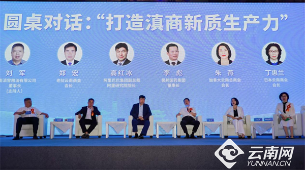 现场还开展以“打造滇商新质生产力”为主题的圆桌对话。会议由云南滇雪粮油有限公司董事长刘军主持,昊邦医药集团董事长李彪,阿里集团副总裁、阿里研究院院长高红冰,加拿大云南总商会会长朱燕,日本云南总商会会长丁惠兰,老挝云南商会会长郑宏,深入探讨了滇商的发展方向和创新路径,为滇商的未来发展探讨方向。