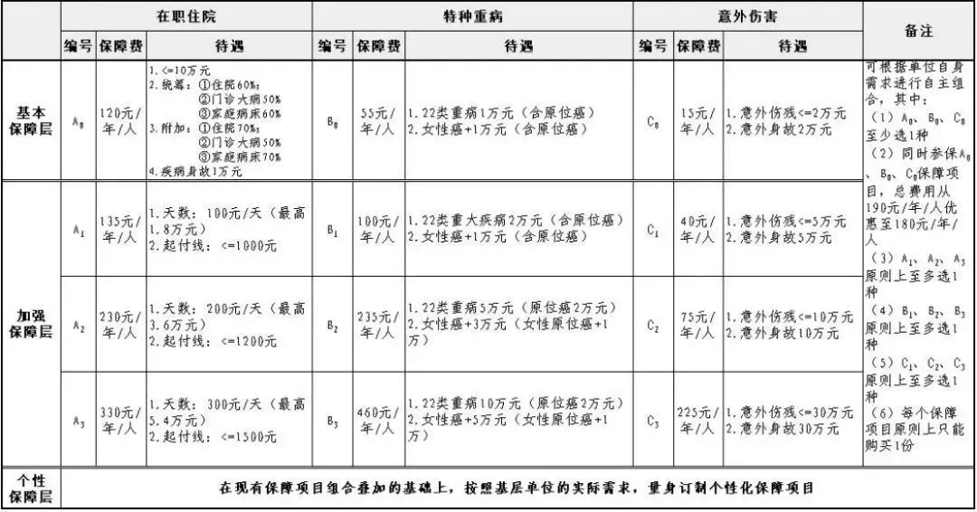 “三纵”是指在职住院、特种重病和意外伤害三类保障项目,“三横”分为基本保障层、加强保障层和个性保障层三个层次。