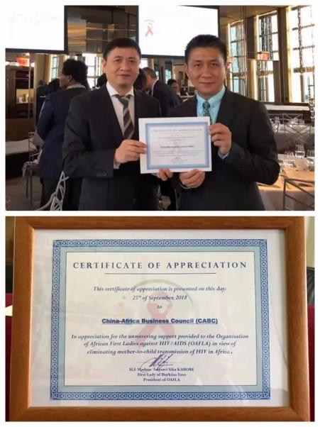 2018年9月,73届联合国大会·非洲第一夫人联合会高级别会议上,非洲第一夫人联合会向中非民间商会颁发嘉许证书,以感谢和表彰中非民间商会在过去三年里对非洲第一夫人联合会的持续支持,以及为非洲终结艾滋病母婴传播所作出的贡献;郑纲副会长代表中非民间商会领取嘉许证书