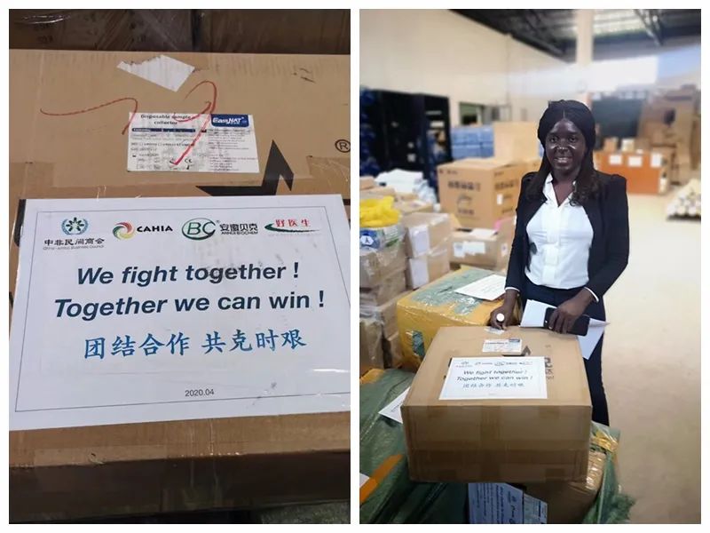 2020年6月,由中非民间商会·中非医疗企业创新促进会协同安徽贝克、好医生、万邦德向位于埃塞俄比亚首都亚的斯亚贝巴的非洲疾病预防和控制中心捐赠了12000套病毒采样设备和培养皿及6000个一次性医用口罩和1000个KN95口罩(左图)。亚的斯亚贝巴的一名非盟工作人员接收物资 (右图)。