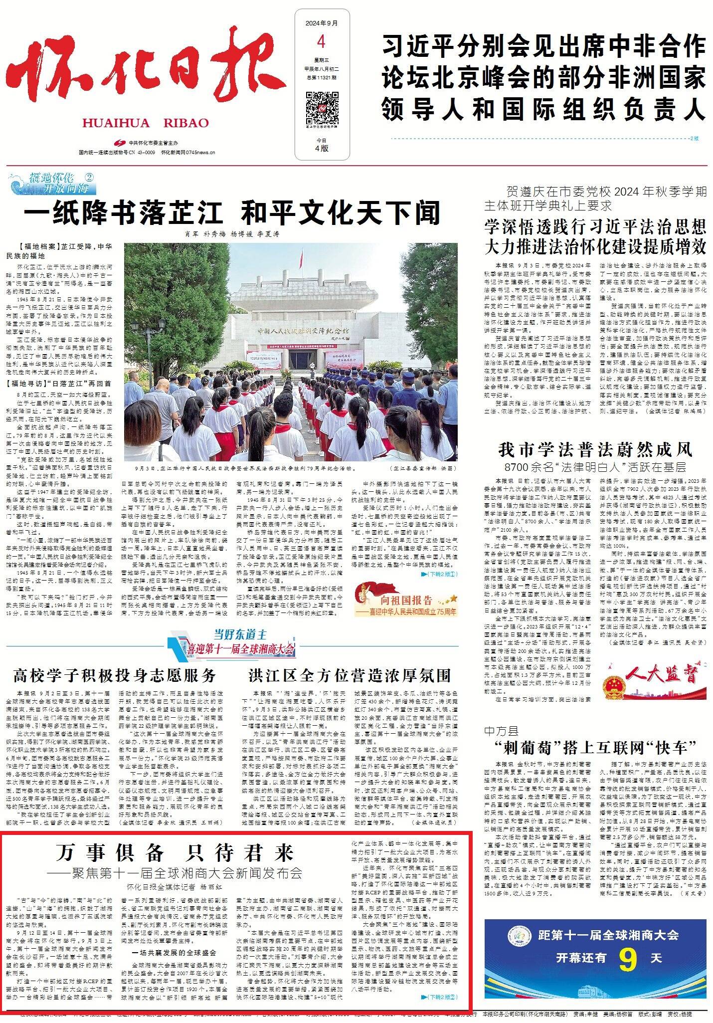 据介绍,怀化向全市发出了《当好东道主,喜迎全球湘商大会》倡议书,推出湘商大会专题系列报道,开展“福地怀化 开放向海——东南亚、粤港澳主流媒体怀化行”“回湘入怀”“网络大咖怀化行”等专题宣传活动,切实让全球湘商感受怀化尊商、护商、亲商、暖商的浓厚氛围。
