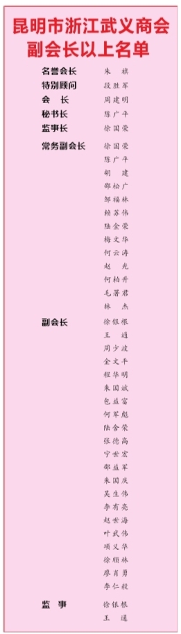 昆明市浙江武义商会成立于2012年6月28日,现有会员单位195家,其中党员单位13家。