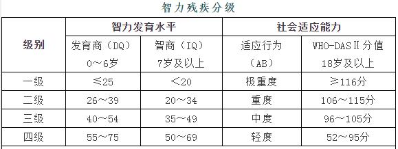 智力残疾分级原则:按0~6岁和7岁及以上两个年龄段发育商、智商和适应行为分级。0~6岁儿童发育商小于72的直接按发育商分级,发育商在72~75之间的按适应行为分级。7岁及以上按智商、适应行为分级;当两者的分值不在同一级时,按适应行为分级。WHO-DASⅡ分值反映的是18岁及以上各级智力残疾的活动与参与情况。智力残疾分级见下表。