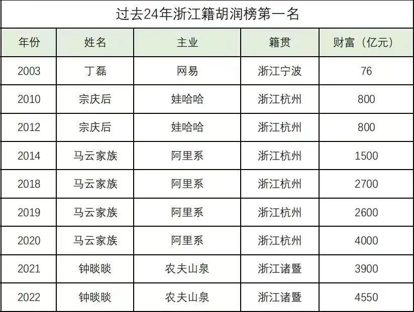 此外,时代周报记者梳理发现,胡润百富榜自1999年创建以来,共计发布榜单24次,浙商共计9次问鼎首富位置。丁磊是首个问鼎中国首富的浙商,马云4次登顶,娃哈哈创始人的宗庆后、钟睒睒也都2次登顶。