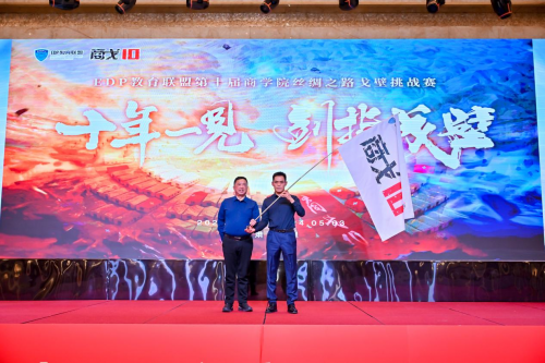EDP教育联盟商学院丝绸之路戈壁挑战赛已成功举办九届,EDP全国戈友总会会长周骏将手中象征着坚毅与果敢的旗帜授给戈友涂涛,这是宣布华商研究院“商戈10”征程的号角。十载风雨同舟路,今朝再谱新篇章,商戈勇士重登热血征途。