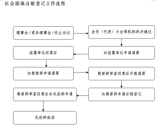 注:经民政部审查同意后,注销的全国性社会团体向登记管理机关交回登记证书、印章和有关财务凭证,将银行账户、税务登记和组织机构代码注销资料的复印件交登记管理机关备案,办理注销公告,提交清理债权公告,领取注销登记批复,向教育部备案。