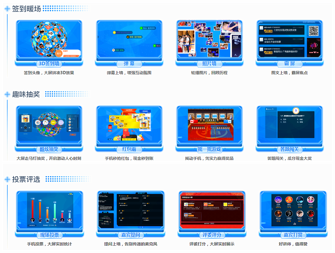 除了以上功能,在年会季期间微媒还为您提供了完备的年会/晚宴活动策划解决方案(邀请函、签到、弹幕、抽奖、红包雨、照片墙、投票评分、流程控台、年会直播/云年会等),同时支持手机遥控管理会议的各项进程(比如ppt、视频音乐文件、节目素材及各种互动游戏的切换)。多样的互动玩法+智能的管理后台,贴心设计,省心省力,不但能很好的解决您年会期间遇到各种问题,更极大的提升了活动的活跃度和品质感。