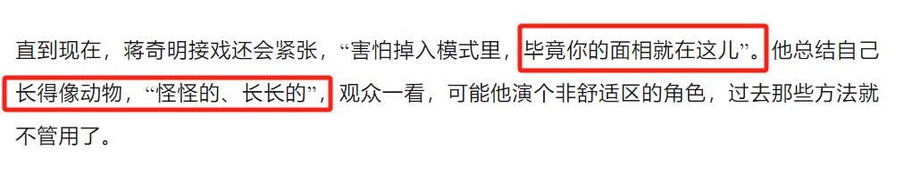 眼睛细长,颧骨高,面部轮廓瘦削,蒋奇明曾自述自己,“长得像像动物,怪怪的,长长的。”