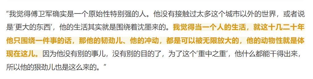 傅卫军从小聋哑,和姐姐相依为命,在蒋奇明的理解里,他的生活就围绕着沈墨展开。