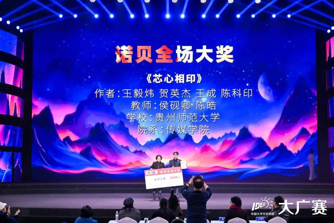 经过现场激烈角逐和尖峰对决,贵州师范大学传媒学院的王毅炜、贺英杰、王成、陈科印同学以作品科大讯飞命题微电影作品《芯心相印》的超凡的创意与优秀的舞台表现力,赢得评委和现场观众的一致好评,最终获得第16届大广赛全场大奖,赢得了由北京诺贝广告公司提供的三万元奖金鼓励。