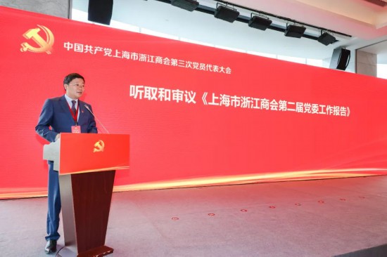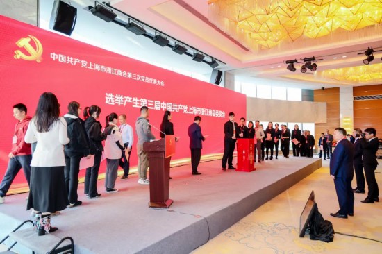 在中国共产党上海市浙江商会第三次党员代表大会上,成功选举了新一届党委班子,商会执行副会长、天通高新集团董事长潘建清担任党委书记,执行副会长、秘书长吴仲春担任党委副书记,执行副会长爱登堡电梯集团董事长李绥、锐力健身装备董事长吴建光、星月投资董事长吕彪,以及副会长庆崟智能董事长许立华、中色实业董事长于丽琴担任党委委员。
