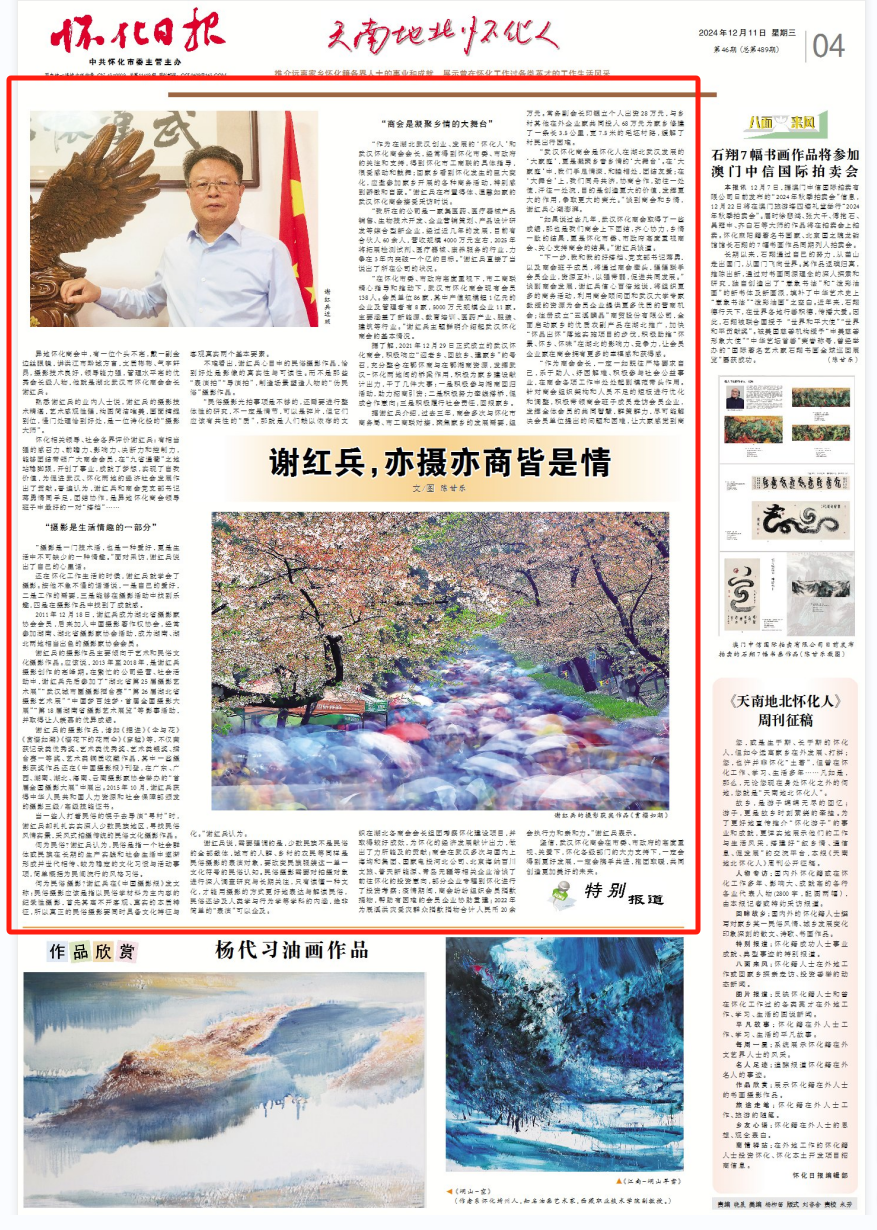 异地怀化商会中,有一位个头不高,戴一副金边丝眼镜,讲洪江市黔城方言,文质彬彬、气宇轩昂,摄影技术良好,领导能力强,管理水平高的优秀会长级人物,他就是湖北武汉市怀化商会会长谢红兵。