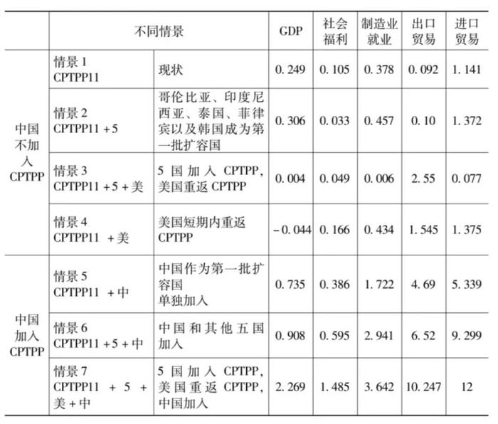 美国彼得森国际经济研究所佩里(Petri)和普卢默(Plummer)的研究也表明,中国加入CPTPP能获得巨大的经济收益。该研究表明,如果中国不加入CPTPP,中国的总收入将因为CPTPP的贸易转移效应损失100亿美元;若加入则能获得2980亿美元的收益。如果CPTPP能够扩容,中国不加入的损失上升到530亿美元;在CPTPP扩容后,若加入则能够获得3250亿美元的收益。