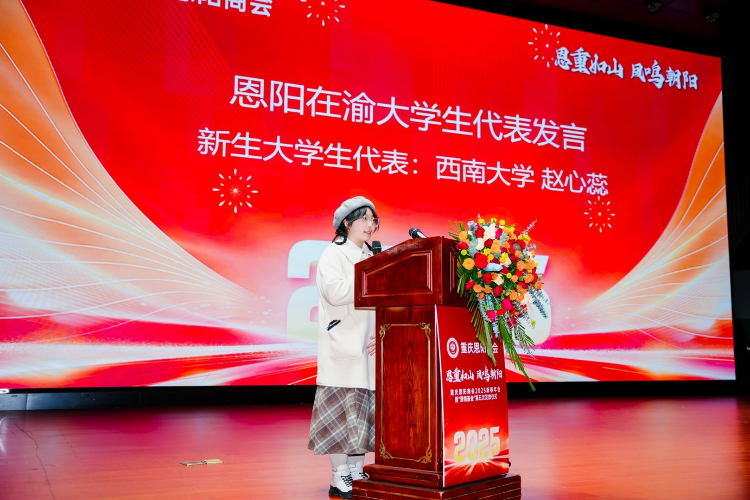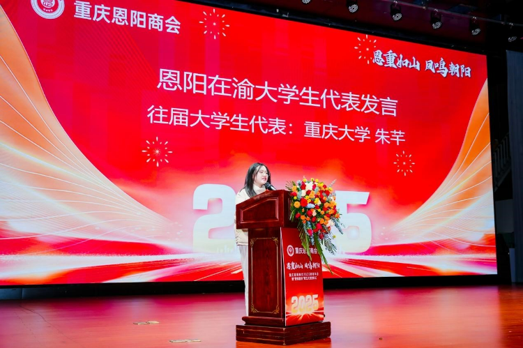 新生代表、西南大学学生赵心蕊,往届生代表、重庆大学朱芊以及毕业生代表李岱峰,先后分享成长感悟,讲述求学故事,诉说社会经历。赵心蕊说:“在这个充满希望的时刻,作为一名来自四川恩阳的学生,我深感幸运和骄傲,因为在远离家乡的日子里,我们不仅感受到了母校的关怀,更收获了来自家乡商会的温暖支持。” 朱芊说:“重庆恩阳商会不仅为我们提供了物质上的援助,更重要的是,搭建了一个与家乡前辈沟通的桥梁。让我们感受到了家乡的温暖和期望,激励我们不断追求卓越。” 李岱峰则希望学弟学妹们在有所成就的时候,能把这种无私帮助反哺传承下去,使得恩阳人的拼搏精神和团结能一代代的延续下去。