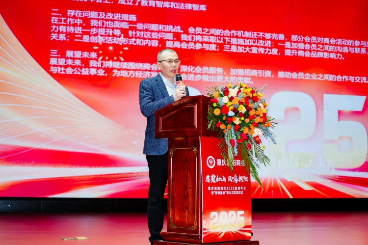 最后,重庆市工商联副主席王进讲话。他传达了中央经济工作会议精神,分析了当前经济形势,鼓励民营企业奋发图强、再建功勋。王进对重庆恩阳商会给予了高度评价:“恩阳商会勇立时代潮头,会员企业艰苦拼搏,主动承担社会责任,‘恩情基金’惠济在渝学子,为众捧薪,温暖他人,也照亮了自己,堪称商会典范!”