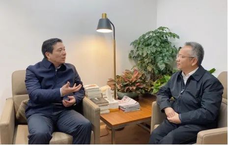 浙江省委统战部副部长、省工商联党组书记陈浩(左)与《小康》杂志社副社长赖惠能交流