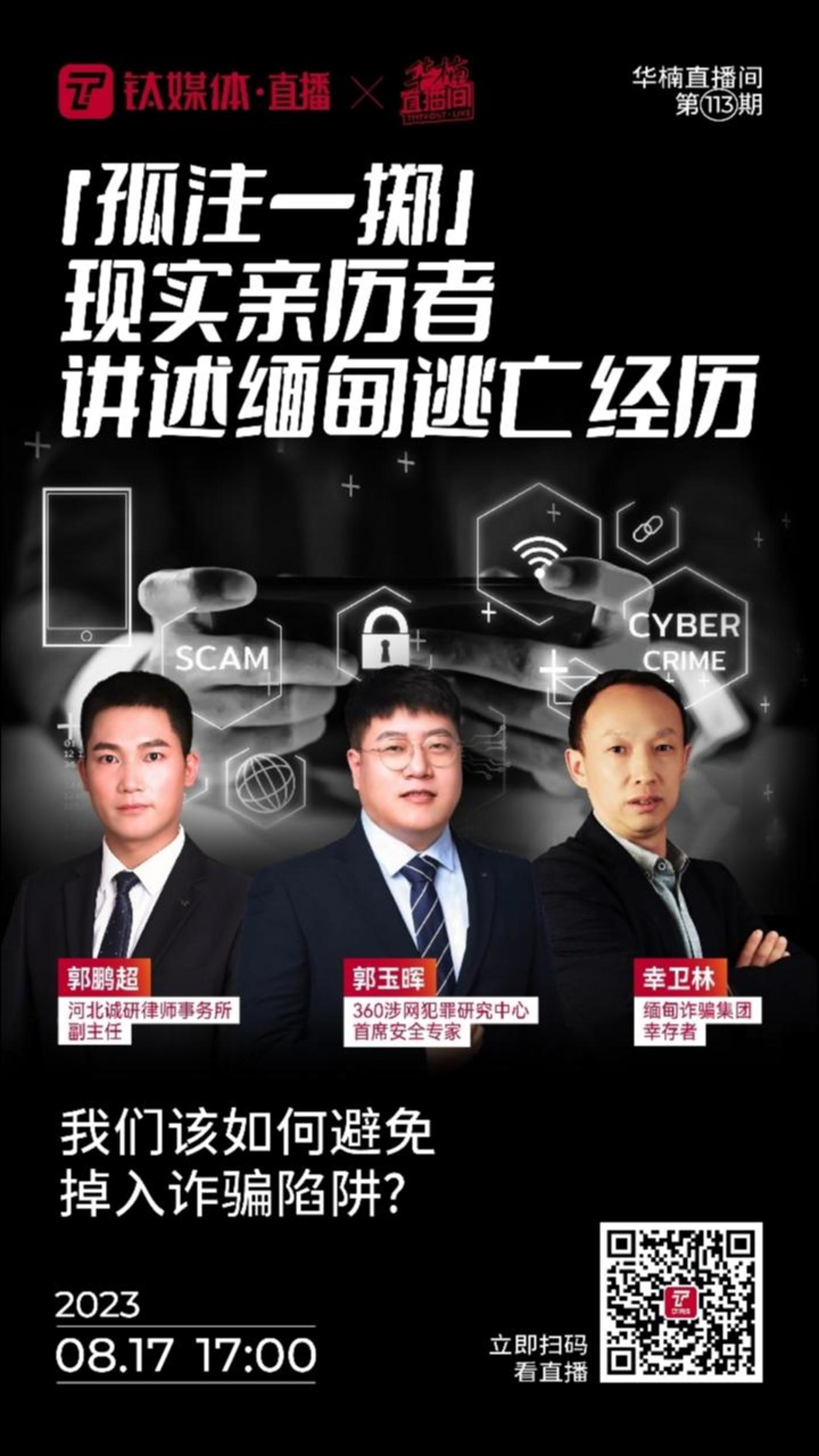 华楠直播间第113期《「孤注一掷」现实亲历者 讲述缅甸逃亡经历》邀请缅甸诈骗集团幸存者 幸卫林、360涉网犯罪研究中心首席安全专家 郭玉晖、河北诚研律师事务所副主任 郭鹏超 在线分享。