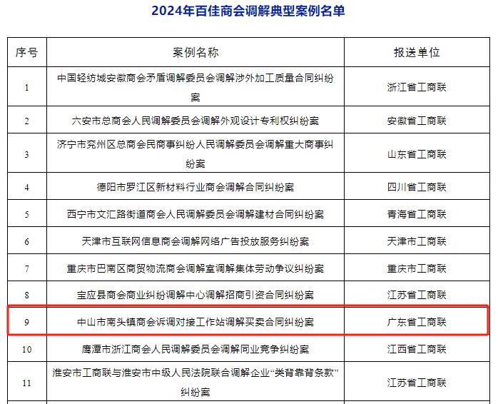 近日,全国工商联办公厅通报“2024年百佳商会调解典型案例”评选结果,中山市第二人民法院与南头镇工商联(商会)诉调对接工作站、商事巡回法庭选送的《“法院+商会”共建机制 助力商事纠纷多元化解》(承办法官:吴婷,调解员:梁锦星)买卖合同纠纷调解案例获评全国工商联“百佳商会调解典型案例”。