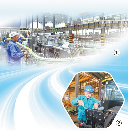 图①:福建盼盼饮料有限公司党员职工在红色示范生产线上检验产品质量。
