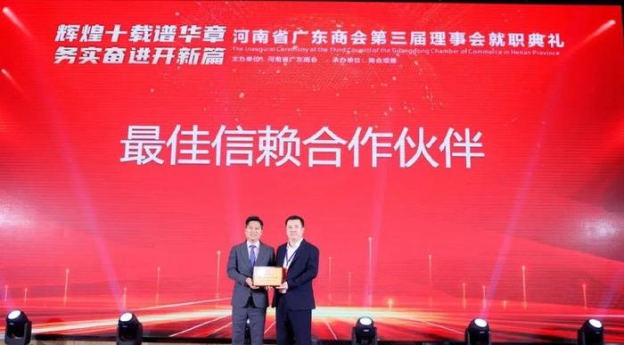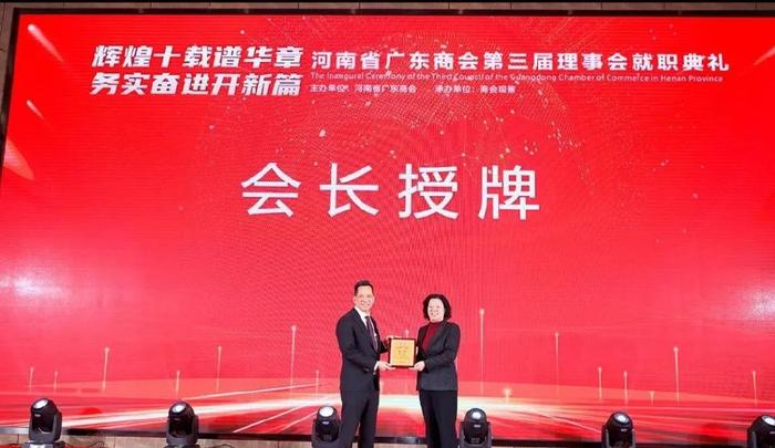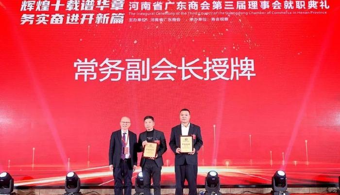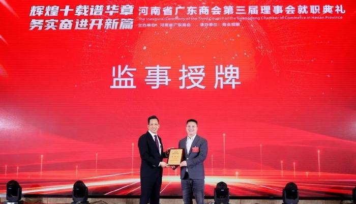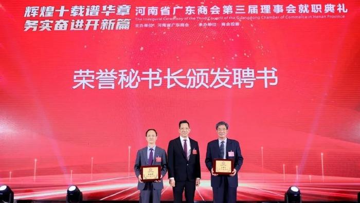 河南省广东商会会长伍坚浓为荣誉秘书长杨瑜聪、丁国宇颁发牌匾
