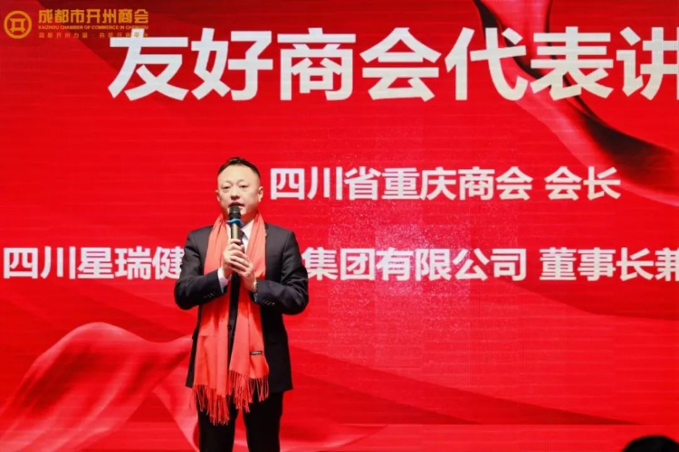 四川省重庆商会会长、四川星瑞健康产业集团有限公司董事长兼总裁吕状文作为友好商会代表发表讲话。他首先表达了对在座企业家朋友和老乡们的美好祝愿,希望大家在2025年身体健康,一切顺利。他还特别提到,期望在川的渝商能够把握机遇,积极作为,为成渝地区双城经济圈建设贡献更多的智慧和力量。吕状文先生的讲话,不仅增进了商会之间的友谊,也为商会未来的交流与合作奠定了良好的基础。