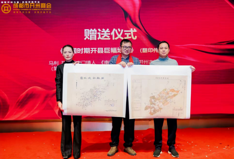 活动现场还举行了隆重的赠送仪式。红旗飘飘书画院院长王健带来了珍贵画作,这些画作不仅具有极高的艺术价值,更是对开州儿女奋斗精神的一种鞭策和鼓励,激励着大家在未来的日子里继续砥砺前行。开州区南门镇人马利在新春团拜之际为商会带来了别样的祝福——《民国时期开县巨幅地图》(翻印件)。这幅地图承载着家乡的历史记忆,让大家直观地感受到家乡百年来的沧桑巨变,引发了浓浓的思乡之情和对家乡发展的深切关注。