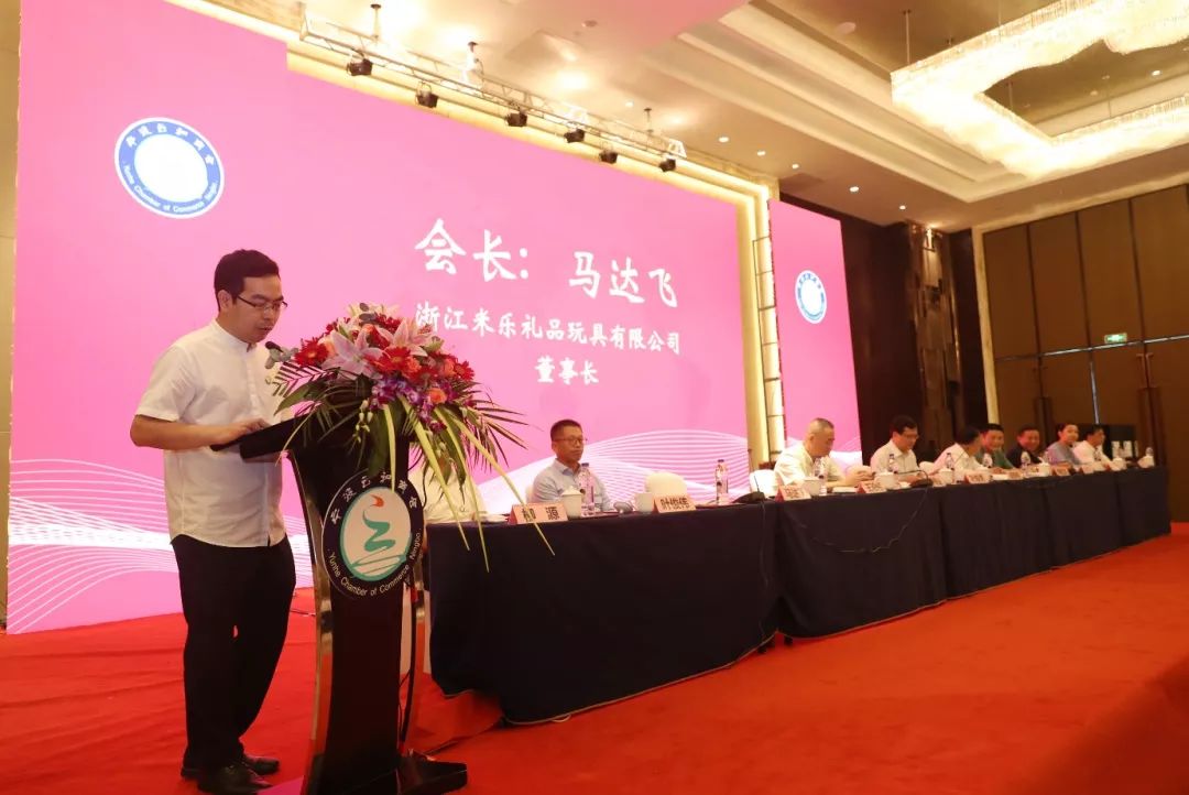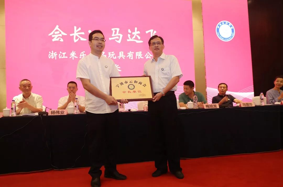 云和县人大常委会主任叶晓勇为云和县总商会宁波分会会长、宁波米乐礼品玩具有限公司董事长马达飞授牌。