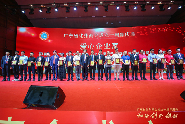 新晋成员授牌仪式结束后,化州商会对杰出会员进行了表彰。广东省化州商会执行会长、广东省化州市丽登饼业有限公司董事长陈衍广获得“特别杰出贡献奖”;曾胜、陈建锋、马亚胜、李儒昌、宋寿明、蔡广信获得“杰出贡献奖”;李观生、黎瑞龙、谭平岳、邹飞鹏、吴海华、李伟强、吴芷夏、陈志云、黄晓梅获得突出贡献奖”。庆典上,还颁发了 “爱心企业家” 奖 、“商会先进工作者”奖。