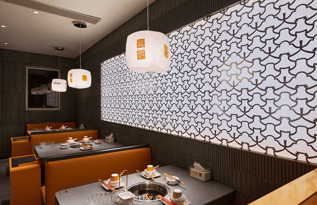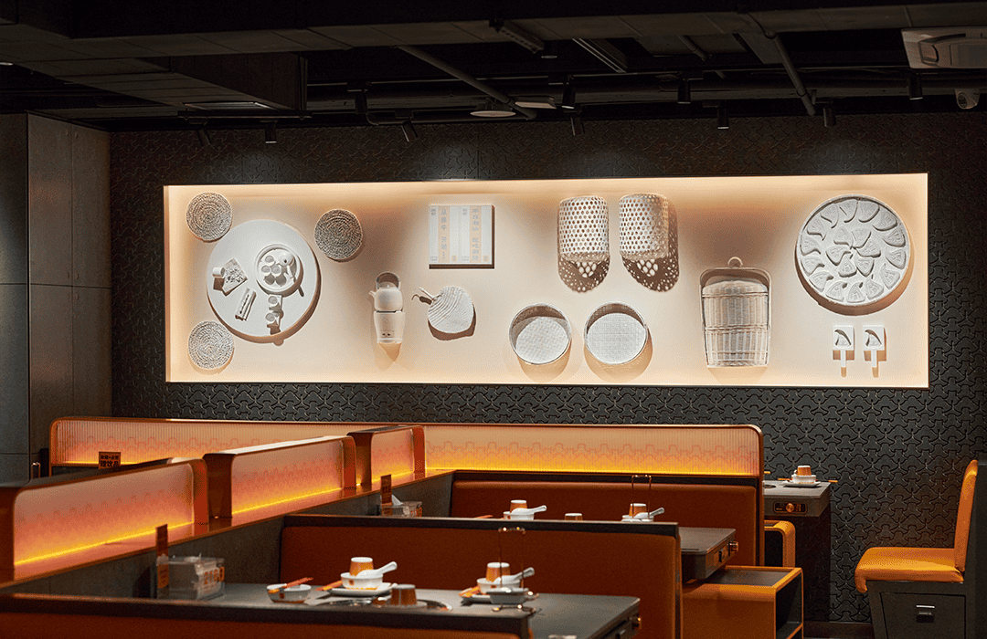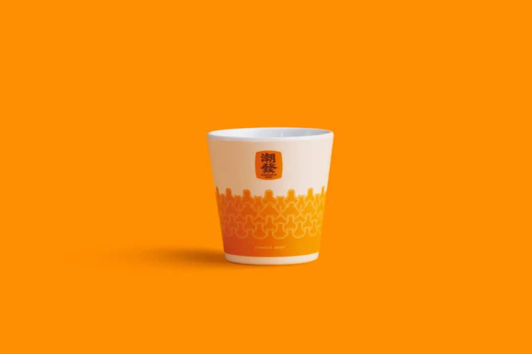 品牌色既有承担认知醒目的功能作用,也能升华用餐氛围的心理体验,我们既想做到品牌的差异化,又想保留潮汕的文化韵味。于是我们从“潮汕灯笼”的万家灯火的颜色氛围中提炼了“灯火橙”的专属品牌色,打造潮发万家灯火“家文化”的氛围。