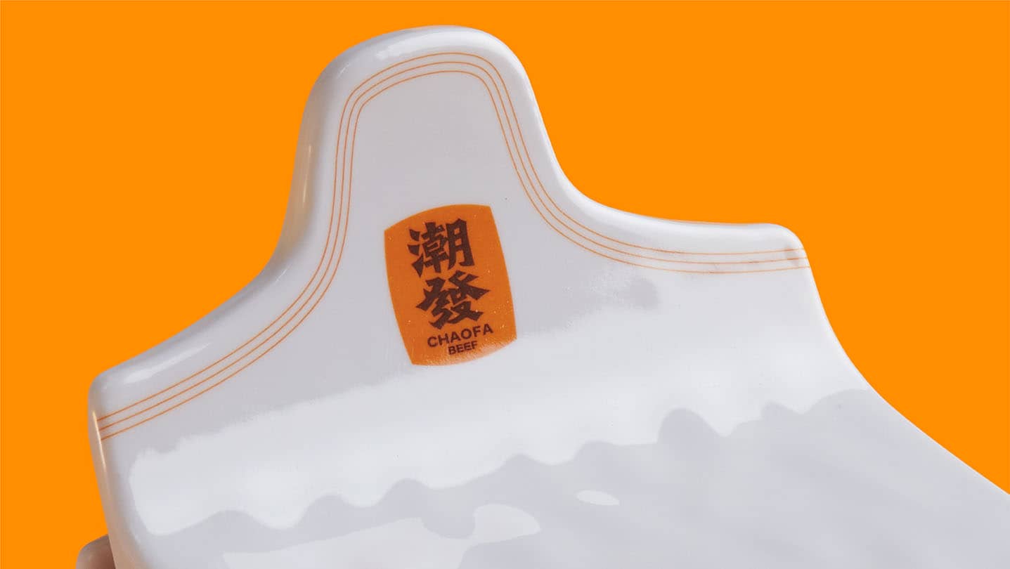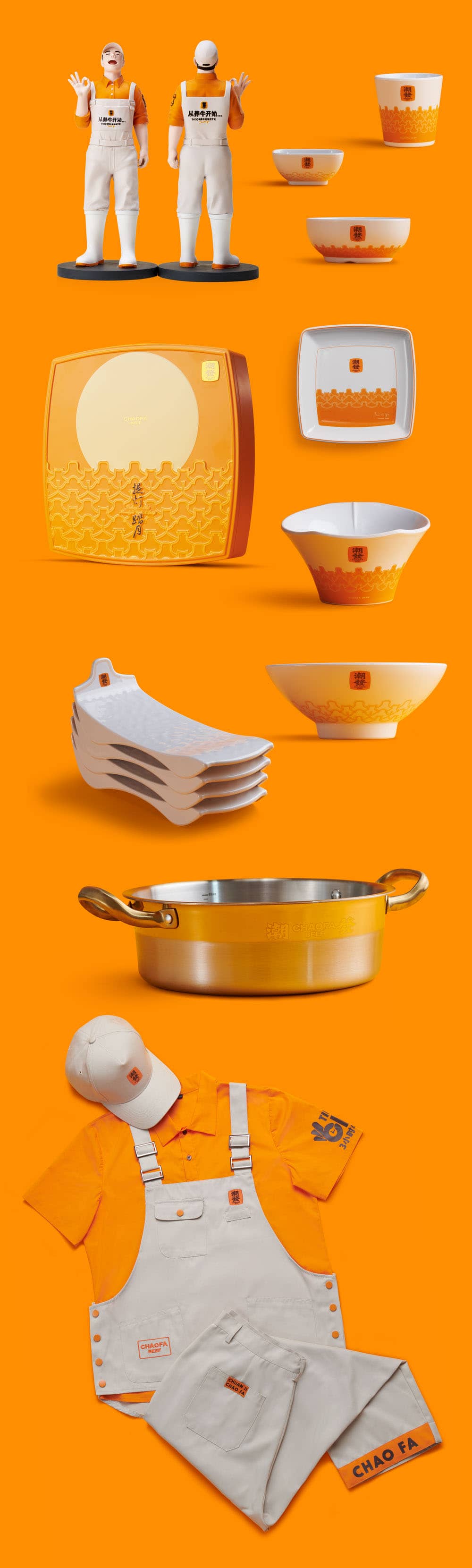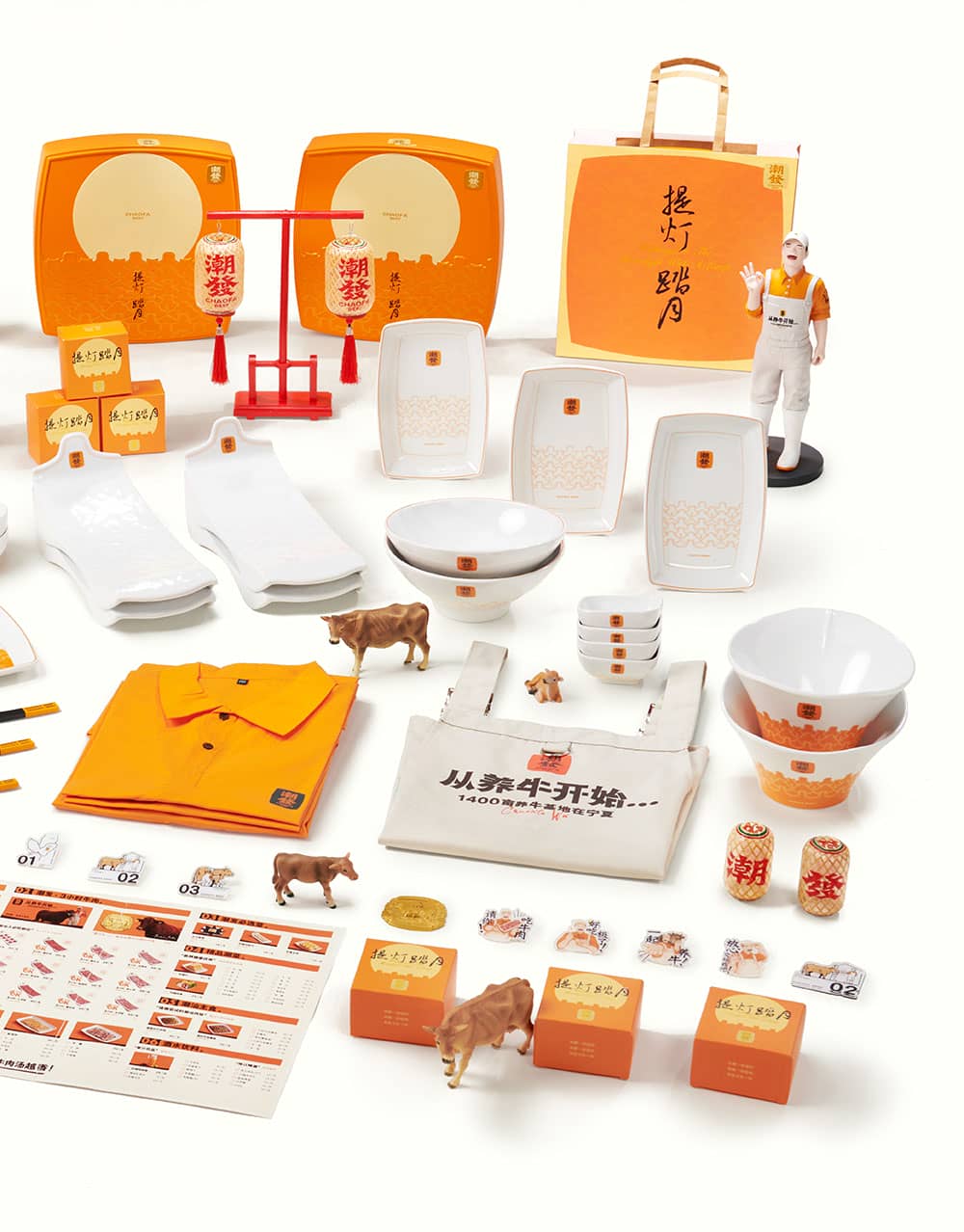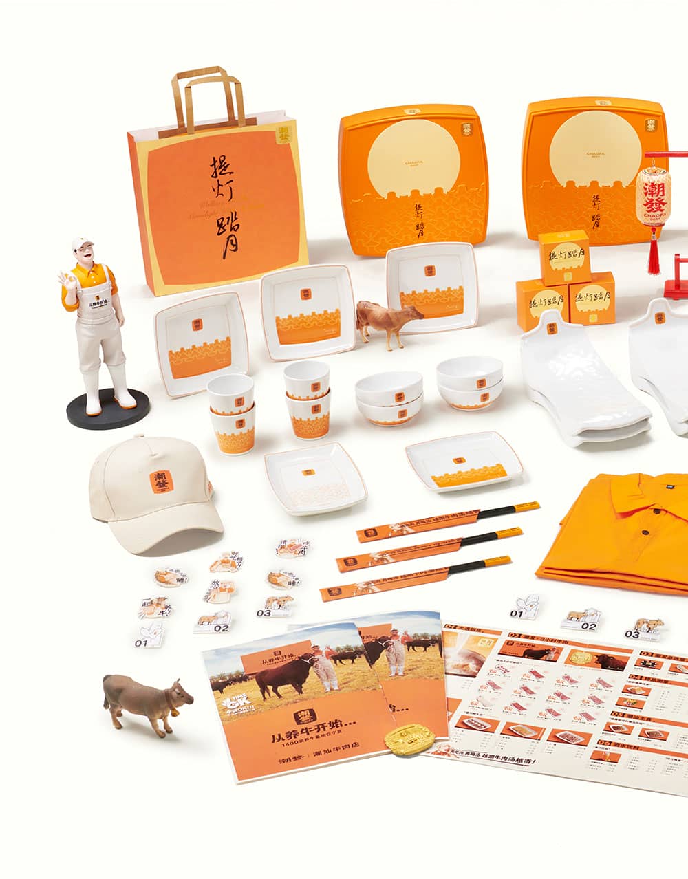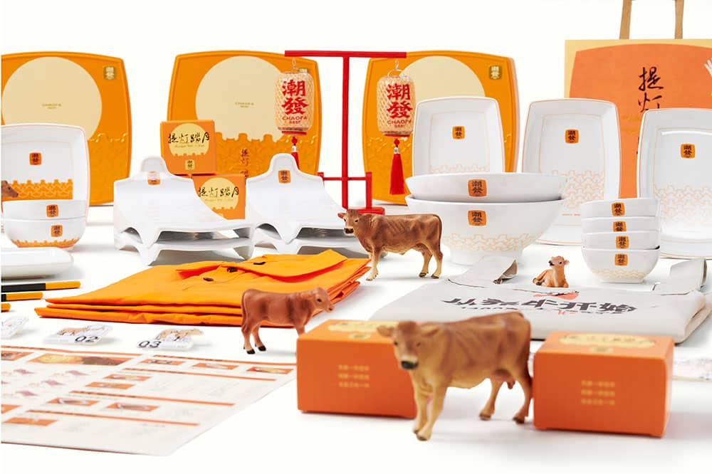 我们将五行山墙“老花”运用在潮发的餐具、墙面、隔断、礼盒包装等各个媒介上,提升潮发整体的品牌统一感和高端价值感。