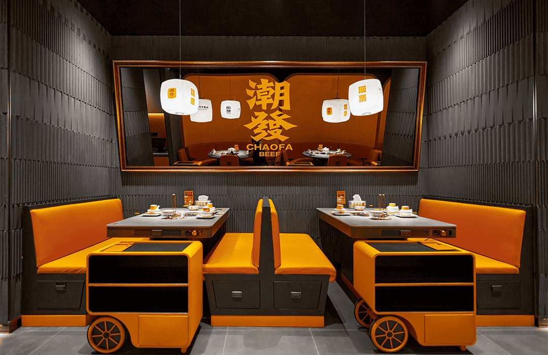 确定了整体大的空间基调外,潮发还需更多具体的细节来支撑空间的“新鲜策略”。因此我们在门店空间的各个细节都增加了具体的装置来加持牛肉的新鲜。